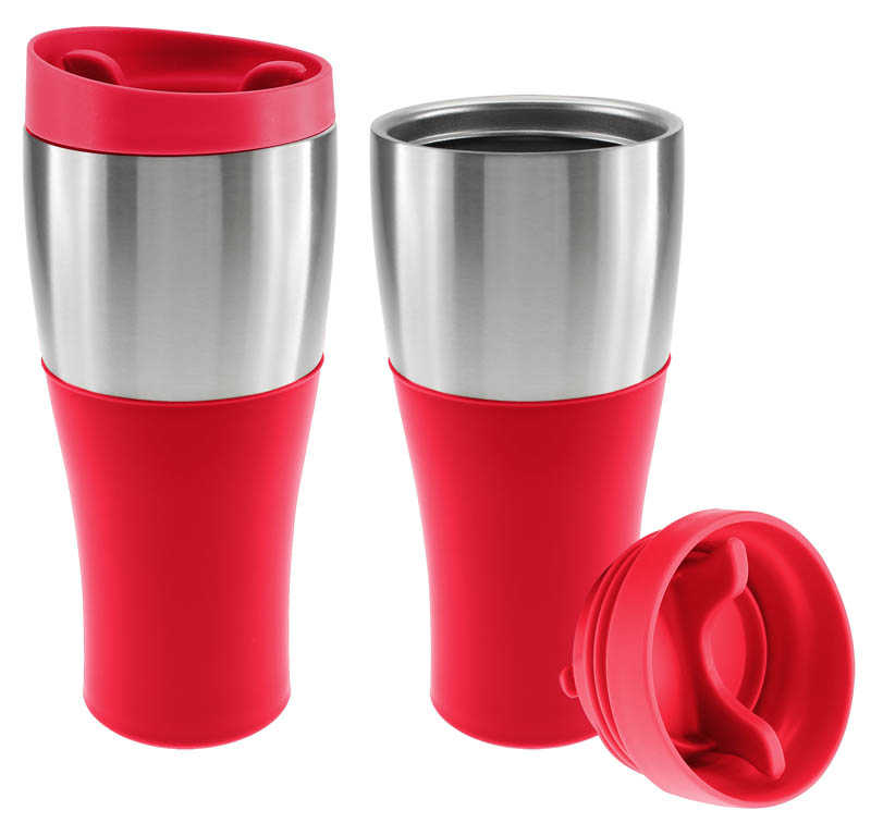 Coffee Mug grande de 470 ml plástico «PP-FRESH», tapa rosca y banda de Acero Inoxidable ideal para imprimir logos. Presentación en caja de cartón plateado.