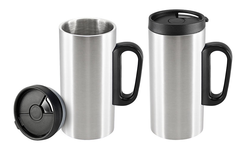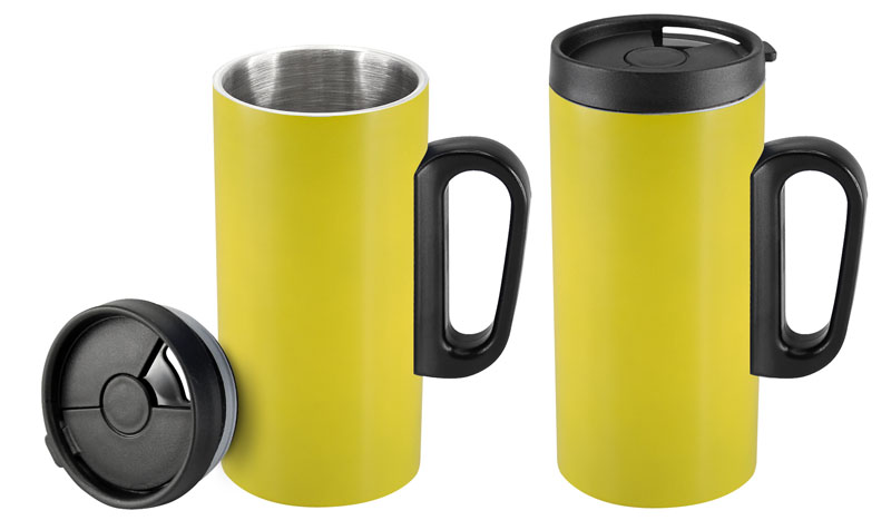 Mini-tazón para café de Acero inoxidable doble pared aislante, cuerpo exterior color. Tapa de plástico PP negro con dosificador móvil.